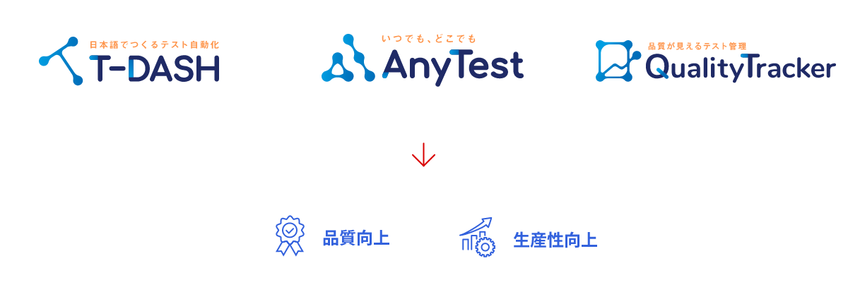 誰でも簡単にテストを自動化できる「T-DASH」、テスト進捗状況のリアルタイム把握やテストケース共有による効率化を実現する「QualityTracker」、Web・アプリの実機テストが遠隔で簡単に行える「AnyTest」など、多彩なツールでソフトウェア開発を支援し、品質向上と生産性向上に貢献します。