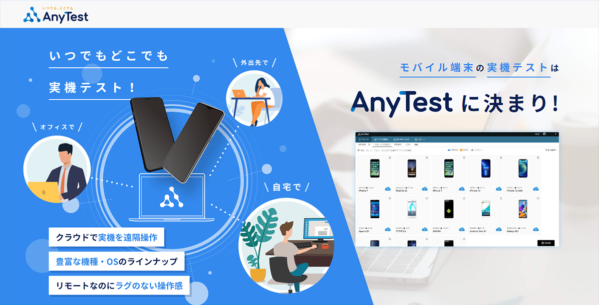 AnyTestは、Web・アプリの実機テストが遠隔で簡単に行えるサービスです。実機を手配して取り寄せる必要がなく、豊富なラインナップから必要な機種をお選びいただき、すぐにテストすることが可能です。