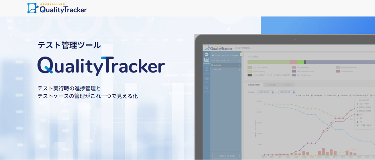 QualityTrackerでは、プロジェクトごとに信頼度成長曲線、テスト進捗、チケット(不具合)の視点で進捗状況を確認できます。テスト結果をクラウド上のテストケースに入力していくため、状況をリアルタイムで把握することができます。